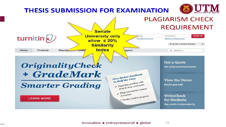 Thesis Submission Requirement For Examination Supervisor Approval Thesis is ready to be evaluated Plagiarism check Verification Fulfill the Post Graduate Academic Rules & Regulation Complete all the required forms Format of thesis must follow UTM Thesis Manual (2018 Edition) Guidelines & Forms can be downloaded at www. sps. utm. my 41