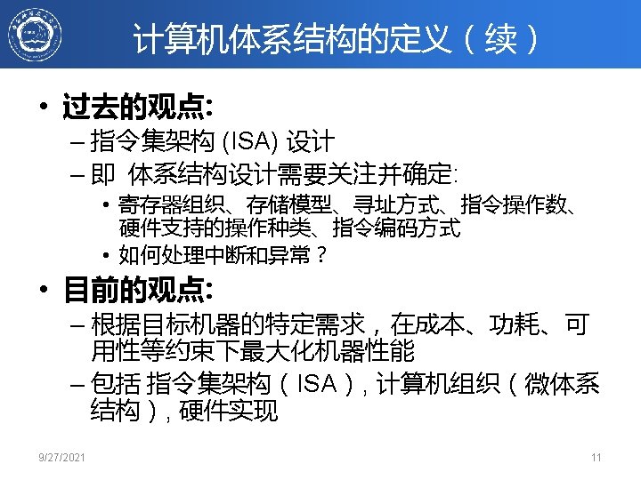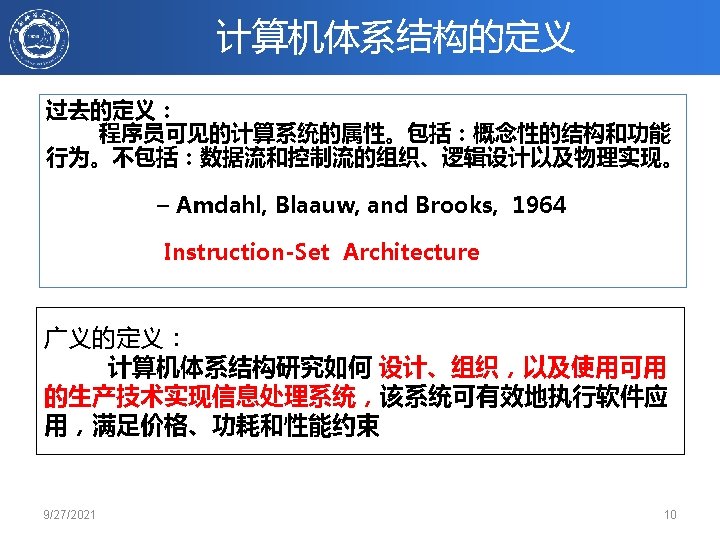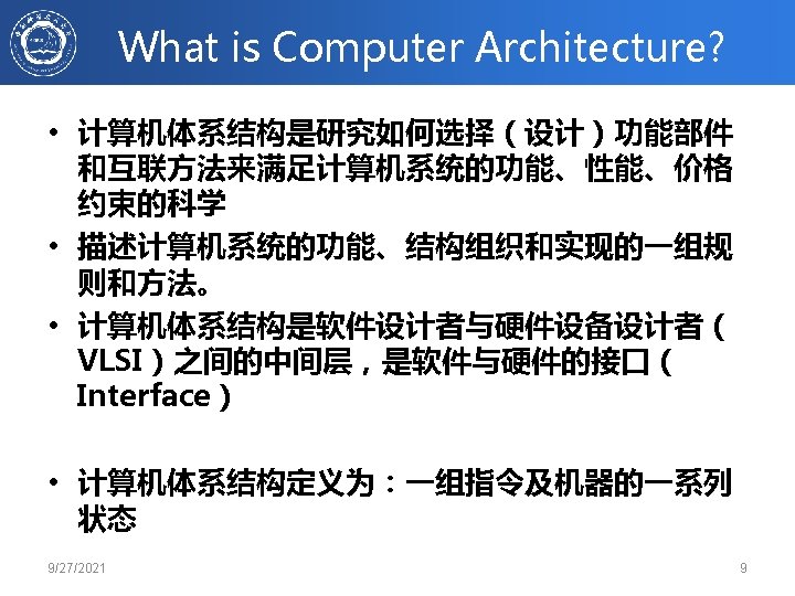 What is Computer Architecture? Application Gap too large to bridge in one step (but there are exceptions, e. g. magnetic compass) Physics 广义的定义:计算机体系结构是抽象层的设计,这些抽象层 使得我们可以使用可用的制造技术高效地实现信息处理应用 系统 9/27/2021 7