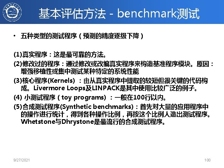 基准测试程序套件 • Embedded Microprocessor Benchmark Consortium (EEMBC) • Desktop Benchmarks – – – SPEC 2017 SPEC 2006 SPEC 2000 SPEC 95 SPEC 92 SPEC 89 • Server Benchmarks – Processor Throughput-oriented benchmarks (基于SPEC CPU benchmarks>SPECrate – SPECSFS, SPECWeb – Transaction-processing (TP) benchmarks (TPC-A, TPC-C, …) • …. . Standard Performance Evaluation Corporation (www. spec. org) 9/27/2021 101