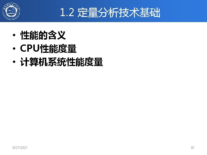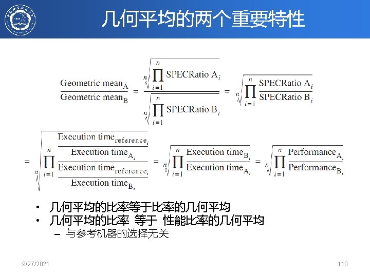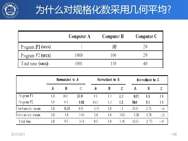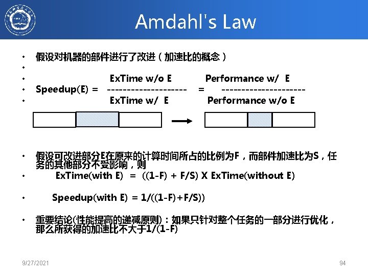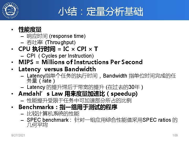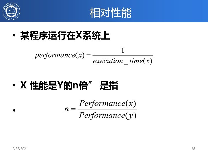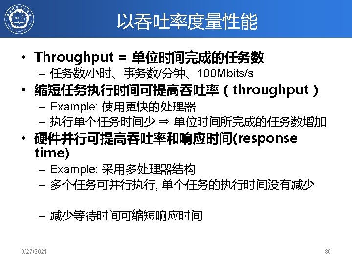 性能的两种含义 Plane DC to Paris Speed Passengers Throughput (pmph) Boeing 747 6. 5 hours 610 mph 470 286, 700 BAD/Sud Concorde 3 hours 1350 mph 132 178, 200 哪个性能高? • Time to do the task (Execution Time) – execution time, response time, latency • Tasks per day, hour, week, sec, ns. . . (Performance) – throughput, bandwidth 这两者经常会有冲突的。 9/27/2021 83