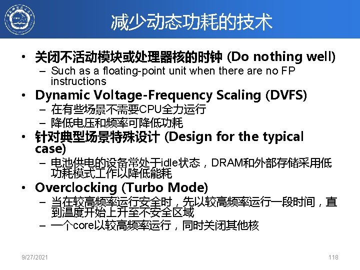 动态能耗和功耗 • 针对CMOS技术, 动态的能量消耗是由于晶体管的on和 off状态的切换引起的 • Dynamic Energy ∝ Capacitive Load × Voltage 2 – the energy of pulse of the logic transition of 0 -1 -0 or 1 -0 -1 – Capacitive Load = Capacitance of output transistors & wires – Voltage has dropped from 5 V to below 1 V in 20 years • Dynamic Power ∝ Capacitive Load × Voltage 2× Frequency Switched • 降低频率可以降低功耗 • 降低频率导致执行时间增加 ->不能降低能耗 • 降低电压可有效降低功耗和能耗 9/27/2021 113