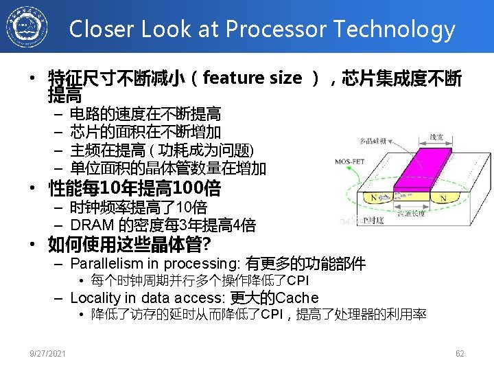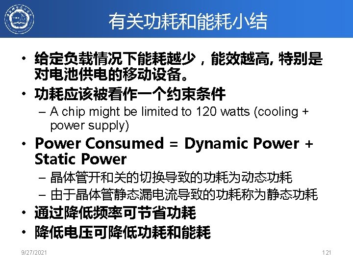 静态功耗(Static Power) • 当晶体管处于off状态时, 漏电流产生的功耗称 为静态功耗 • 随着晶体管尺寸的减少漏电流的大小在增加 • Static Power = Static Current × Voltage – Static power increases with the number of transistors • 静态功耗有时会占到全部功耗的50% – Large SRAM caches need static power to maintain their values • Power Gating: 通过切断供电减少漏电流 – To inactive modules to control the loss of leakage current 9/27/2021 120