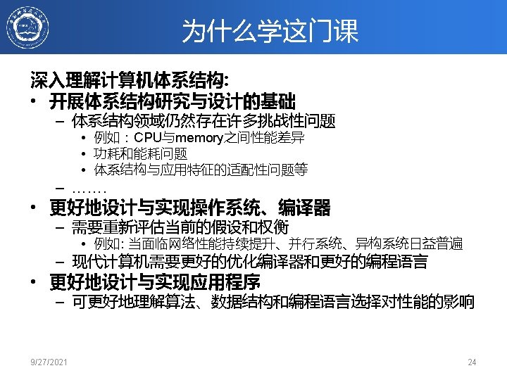 本课程的主要内容 • 简单机器设计(Chapter 1, Appendix A, Appendix C) – ISAs, Iron Law, simple pipelines • 存储系统(Chapter 2,Appendix B) – DRAM, caches, virtual memory systems • 指令级并行(Chapter 3) – score-boarding, out-of-order issue • 数据级并行(Chapter 4) – vector machines, VLIW machines, multithreaded machines • 线程级并行(Chapter 5) – memory models, cache coherence, synchronization • 面向特定领域的处理器体系结构(DSA) – IPU、DSP、GPU 9/27/2021 23