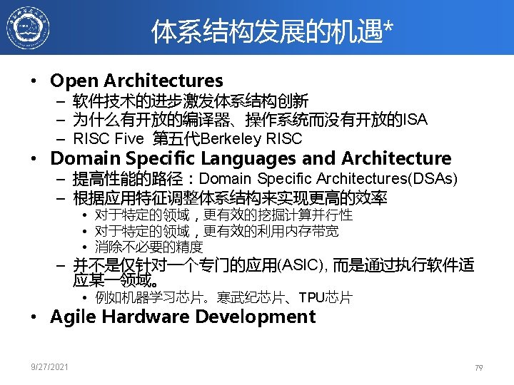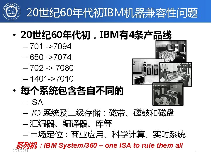 体系结构的发展历史、现状及趋势* • 体系结构发展历史 – Mainframes, – Minicomputers, – Microprocessors – RISC vs CISC,VLIW • 体系结构现状及挑战 *A New Golden Age for Computer Architecture: Domain-Specific Hardware/Software Co-Design, Enhuanced Security, Open Instruction Sets, and Agile Chip Development John Hennessy and David Patterson June 4, 2018 https: //www. youtube. com/watch? v=3 LVe. Ejsn 8 Ts – Denard Scaling 及 Moore’s Law 的终结 – Security • 体系结构发展机遇 – Open Architectures – Domain Specific Languages and Architecture – Agile Hardware Development 9/27/2021 32