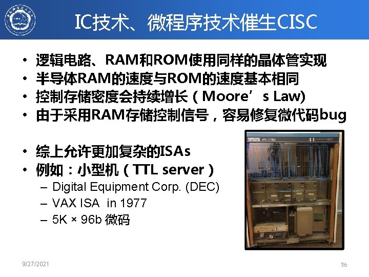 数据通路vs控制 • 处理器设计可划分为两部分 – Datapath: 存储和操作数据 – Control:产生控制信号作用于数据通路 • 过去对处理器设计师的最大的挑战是产生正确的控制序列 • Maurice Wilkes 发明了微程序设计方法 来设计控制部件* (1953) • Logic expensive vs. ROM or RAM • ROM cheaper than RAM • ROM much faster than RAM * "Micro-programming and the design of the control circuits in an electronic digital computer, " M. Wilkes, and J. Stringer. Mathematical Proc. of the Cambridge Philosophical Society, Vol. 49, 1953. 9/27/2021 34