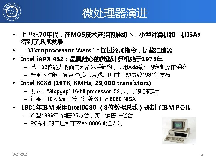 Writable Control Store • 如果控制存储是RAM,那么就可以定制“固件” 应用程序:“Writable Control Store” • 微程序研究在学术界很流行 – Patterson Phd Thesis* – 有专门的国际会议SIGMICRO • Xerox Alto (Bit Slice TTL)(1973) – 第 1台具有GUI和网络的个人计算机 – Bit. Blt和网络控制器用微码实现 * Verification of microprograms, David Patterson, UCLA, 1976 ** “The design of a system for the synthesis of correct microprograms, ” David Patterson, Proc. 8 th Annual Workshop of Microprogramming, 1975 9/27/2021 37