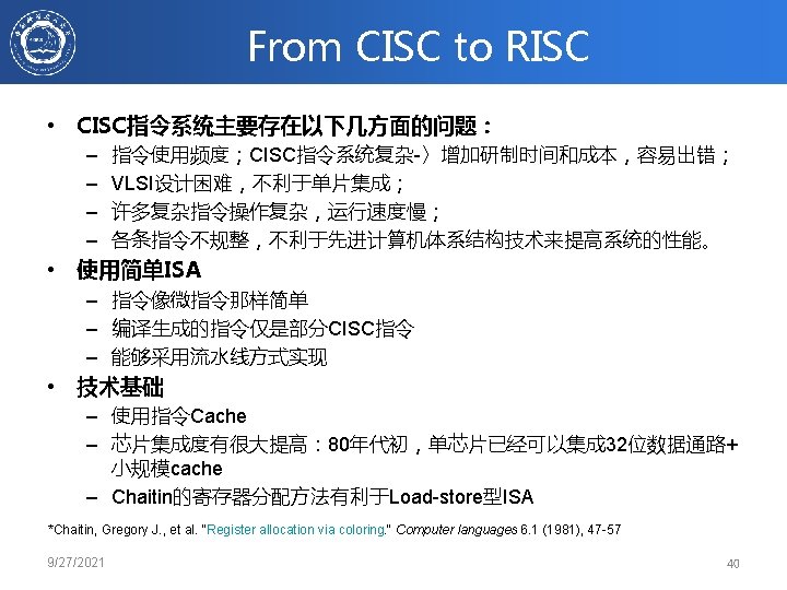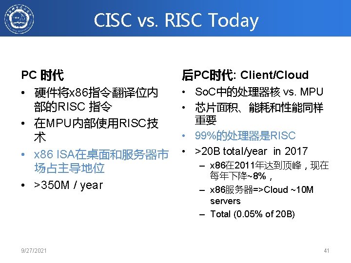80年初:微程序控制机器分析 • 用高级语言编程成为主流 – 关键问题:编译器会生成什么指令?(ISA vs. Compiler) • IBM的John Cocke团队 – 为小型计算机 801(ECL Server)开发了更简单的 ISA 和编译器 – 移植到IBM 370,仅使用IBM 370的简单的寄存器-寄存器及 load/store指令 – 发现:与原IBM 370相比,性能提高 3 X • 80年代初,Emer和Clark (DEC)发现 – VAX 11/180 CPI = 10! – VAX ISA 的 20%指令 (占用了60%的微码)仅占用了 0. 2%的执 行时间 • Patterson:如何修复微处理器中的微程序bug,投稿 ’ 79 DEC 后,引发对ISA合理性的研究 * "A Characterization of Processor Performance in the VAX-11/780, " J. Emer and D. Clark, ISCA, 1984. ** “RISCy History, ” David Patterson, May 30, 2018, Computer Architecture Today Blog 9/27/2021 39