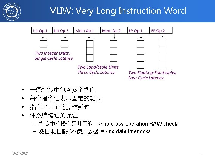 From RISC to Intel/HP Itanium,EPIC IA-64 • EPIC 是Intel为他们的VLIW结构的命名 – Explicitly Parallel Instruction Computing – 二进制 目标码兼容的 VLIW – 从1994年与HP合作开发 • EPIC IA-64 是 Intel 32位x 86的后继(64位ISA) – IA-64= Intel Architecture 64 -bit – AMD 有自己的AMD 64 技术, 2003年推出业界首款 64位 处理器 – 第一款Itanium 2002年推出,不兼容IA-32 – 很多公司放弃RISC转而选择Itanium,因为他们普遍认 为这是必然的(Microsoft, SGI, Hitachi, … 9/27/2021 43