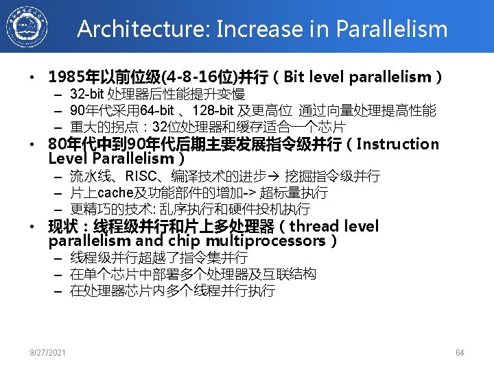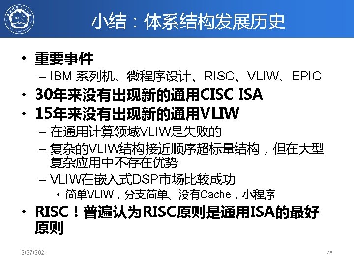 VLIW的问题及EPIC的失败 • 编译器无法处理整型类代码(指针)中的复杂依赖项 • 代码量膨胀 • 不可预知的分支 • 可变的存储访问延迟(不可预知的cache失效) – 乱序执行技术可处理Cache延迟 • 乱序执行覆盖了VLIW的优势 • The Itanium approach. . . was supposed to be so terrific –until it turned out that the wished-for compilers were basically impossible to write. ” - Donald Knuth, Stanford 9/27/2021 44