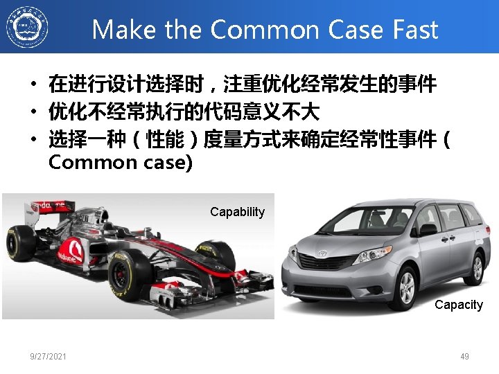 Defining CPU Performance • X比Y性能高的含义是什么? • Ferrari vs. School Bus? • 2013 Ferrari 599 GTB – 2 passengers, 11. 1 secs in quarter mile • 2013 Type D school bus – 54 passengers, quarter mile time? http: //www. youtube. com/watch? v=Kwy. Co. Quh. UN A • 响应时间: e. g. , time to travel ¼ mile • 吞吐率/带宽: e. g. , passenger-mi in 1 hour 9/27/2021 82