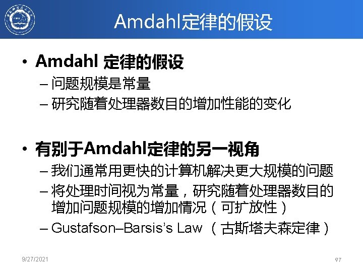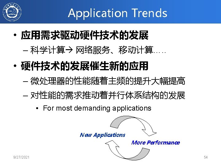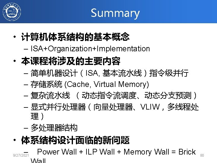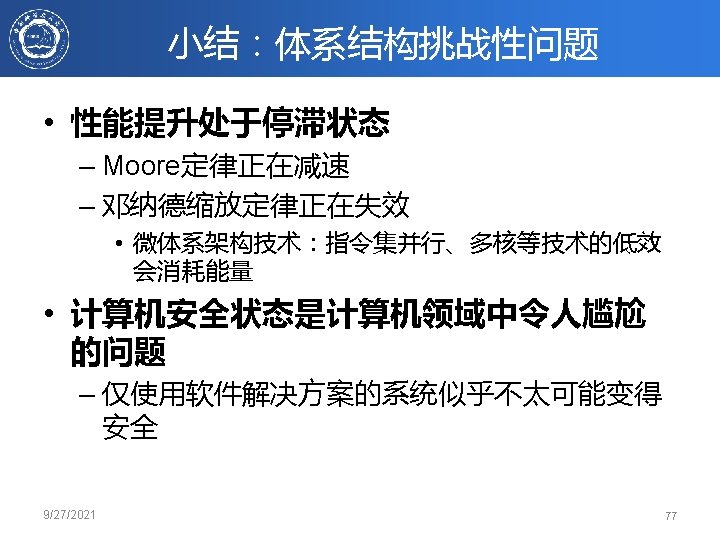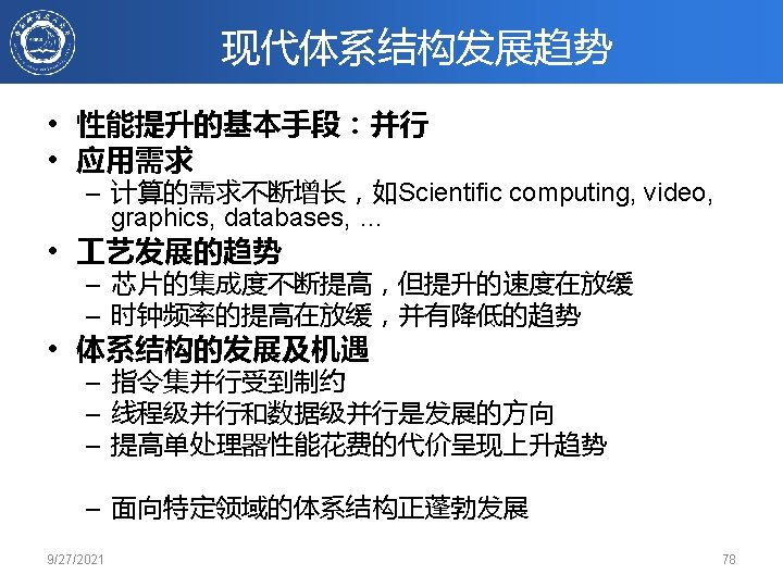 有关体系结构的新旧观念 • • Old Conventional Wisdom: Power is free, Transistors expensive New CW: “Power wall” Power expensive, Transistors free Old CW: 通过编译、体系结构创新来增加指令级并行 (Out-of-order, speculation, VLIW, …) New CW: “ILP wall” 挖掘指令级并行的收益越来越小 Old CW: 乘法器速度较慢,访存速度比较快 New CW: “Memory wall” 乘法器速度提升了,访存成为瓶颈 (200 clock cycles to DRAM memory, 4 clocks for multiply) Old CW: 单处理器性能 2 X / 1. 5 yrs New CW: Power Wall + ILP Wall + Memory Wall = Brick Wall – 单处理器性能 2 X / 5(? ) yrs 芯片设计的巨大变化: multiple “cores” (2 X processors per chip / ~ 2 years) • 越简单的处理器越节能 9/27/2021 75