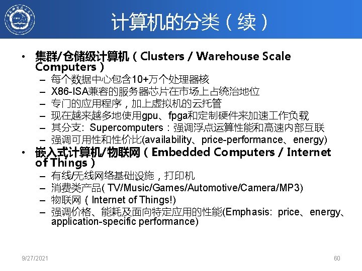 计算机的分类 • 个人移动设备 (PMD) – 智能手机、平板电脑 – ARM-ISA兼容的通用处理器芯片(So. C)在市场上 处于统治地位 – So. C中包含大量的专用加速器 (radio, image, video, graphics, audio, motion, location, security, etc. ) – 强调能效和实时性(energy efficiency and realtime) • 桌面计算(Desktop Computing) – 强调性价比(price-performance) • 服务器(Servers) – 强调可用性、可缩放性、吞吐率(availability, scalability, throughput) 9/27/2021 58