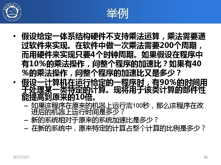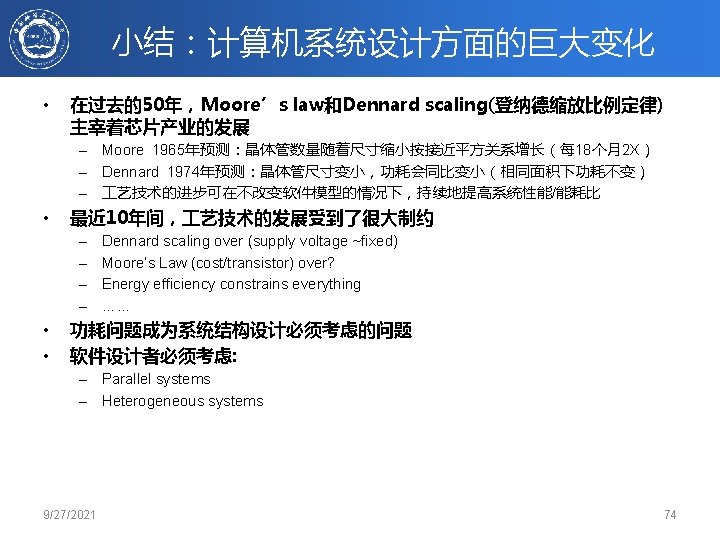 03/04 -review • 计算机系统 – 个人移动设备 (PMD) • Emphasis on energy efficiency and real-time – 桌面计算(Desktop Computing) • Emphasis on price-performance – 服务器(Servers) • Emphasis on availability, scalability, throughput – 集群/仓储级计算机(Clusters / Warehouse Scale Computers) • Emphasis on availability and price-performance – 嵌入式计算机(Embedded Computers) • Emphasis: price 9/27/2021 73