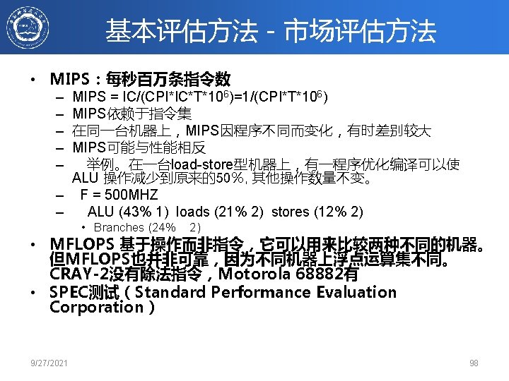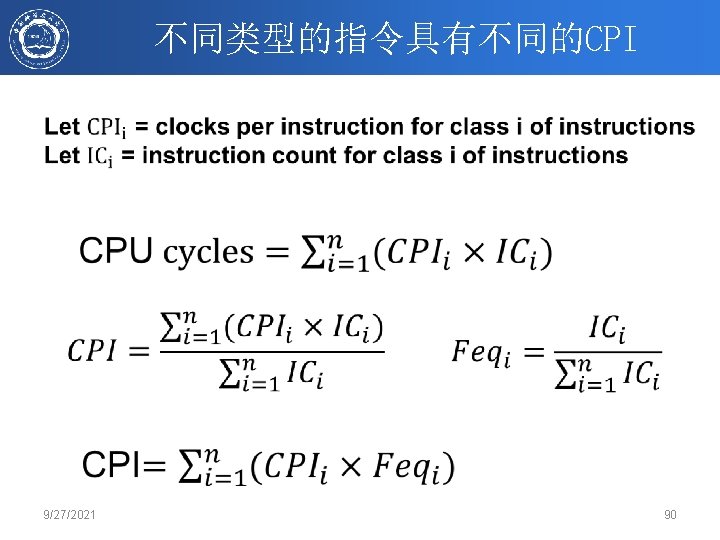 CPI计算举例 Base Machine (Reg / Reg) Op Freq CPIi*Fi ALU 50% 1. 5 Load 20% 2. 4 Store 10% 2. 2 Branch 20% 2. 4 1. 5 9/27/2021 (% Time) (33%) (27%) (13%) (27%) 91