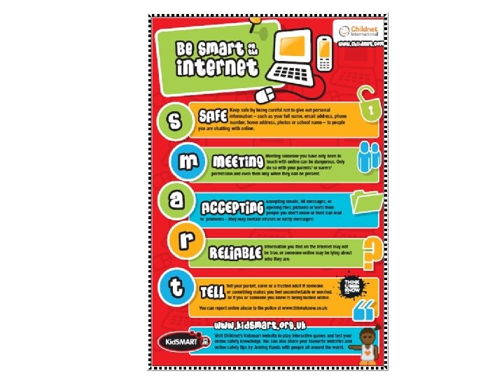 Online Safety • Taught regularly throughout the year as part of our Computing and PSHE (Personal, Social and Health education) curriculum • We follow the SMART e-saftey rules • In Year 1 our online safety focus is on the use of age appropriate websites and apps not sharing your personal information online knowing what to do if something worries or upsets you online
