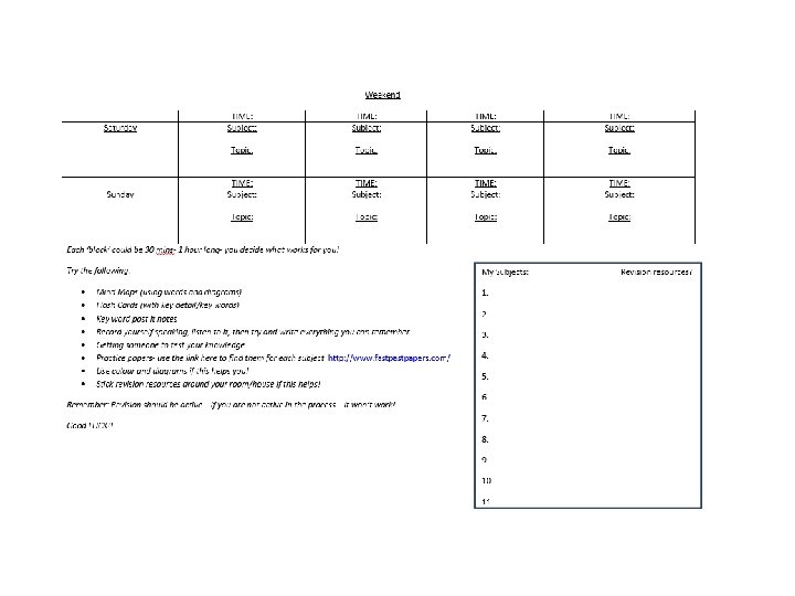 Using Technology for Revision • Highly useful but can be a minefield of distractions. • Stick to known websites, don’t aimlessly search. • Always add GCSE to any search terms. • Extreme discipline/supervision needed if using You. Tube. • Use technology to provide something different. • Limit screen time. • Never just revise online. • NEVER bring technology into an exam.