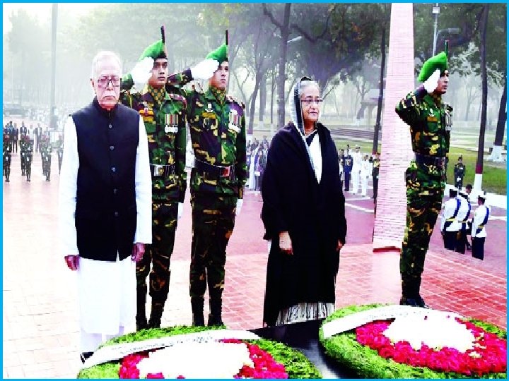Early in the morning the President and the Prime Minister on behalf of the nation place floral wreaths at the National Musolium at Savar. Then diplomats, political parties, social and cultural organisations, and freedom fighters pay homage to the martyrs. People from all walks of life also come there with rallies and processions. There are several cultural programmes throughout the day highlighting the heroic struggle and sacrifice in 1971.