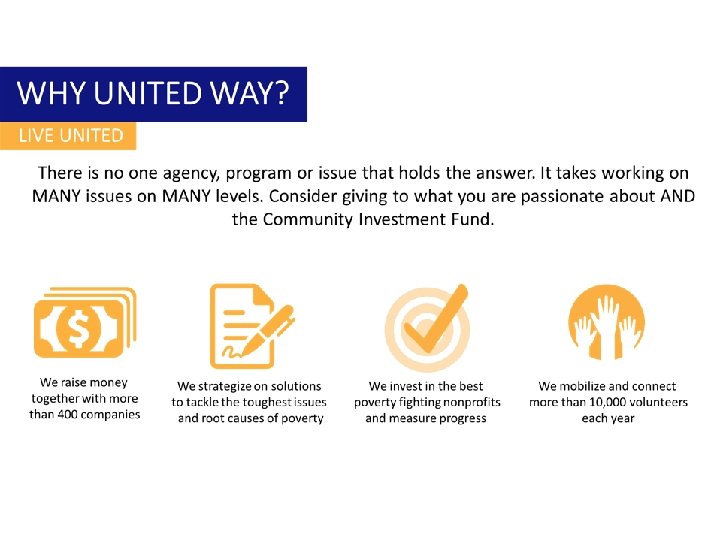 Running a Successful Campaign • At your table, please discuss: – What motivates you to give to the United Way? What motivates your colleagues? – What obstacles or concerns keep people from giving? – How have captains at your table been successful getting a high response rate in the past? – What resources might help you get more responses?