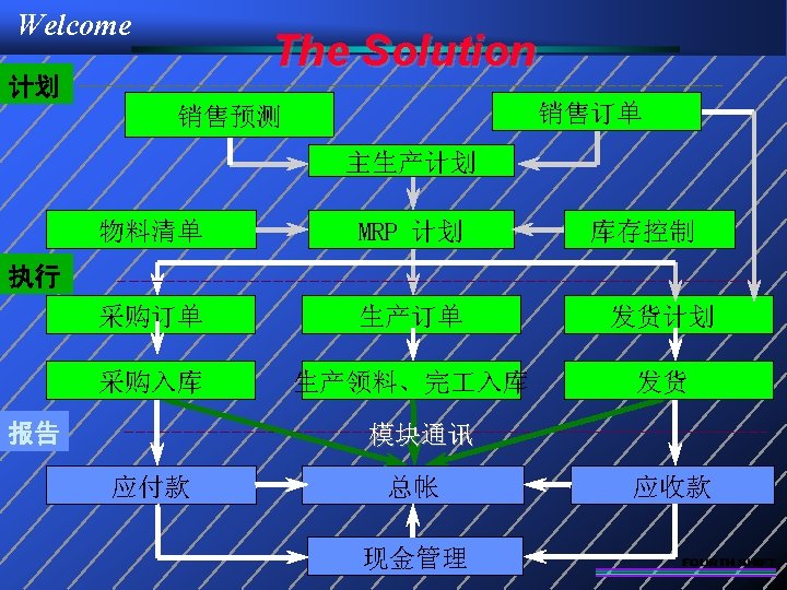 Welcome The Solution Planning Sales Forecast Master Schedule Bills of Material Execution Purchase Order Inventory MRP Planning Mfg Order Customer Order General Ledger Accounts Receivable Reporting Accounts Payable Cash Management