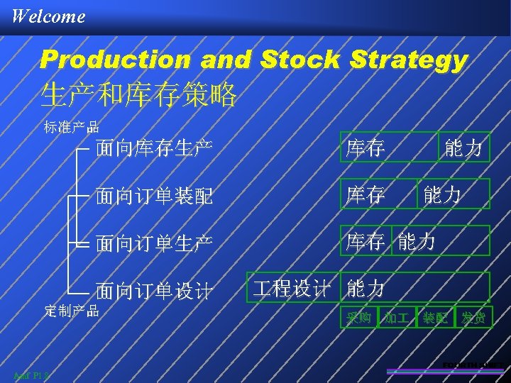 Welcome key Elements 关键要素 • Customer demands (Forecast, Customer Order) 客户需求 (销售预测、客户订单) • Master Schedule 主生产计划 • Bill of material 物料清单 • Inventory 库存 • Manufacturing schedule and shop capacity 生产规划及车间能力 • Shop calendar 车间日历 Amf P 1. 5