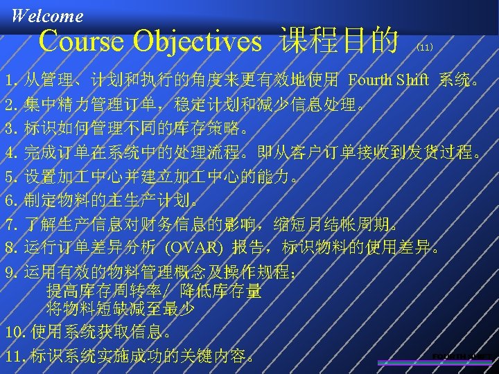 Welcome Introductions 自我介绍 • • • Name 姓名 Company Product or Service 公司名称及产品 Job or Area of Responsibility 作岗位 Implementation Status 实施状态 Your Experience Using Fourth Shift 使用 Fourth Shift 系统的经验 • Your Primary Objective for Attending Class 参加本课程的主要目的