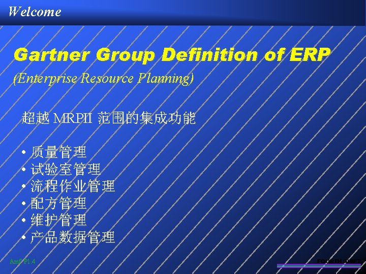 Welcome The Developing Stage History of MRPII/ERP 年代 MRP/ERP 40 60 70 80 90 订货点法 时段式 MRP 闭环 MRP II ERP Amf P 1. 3