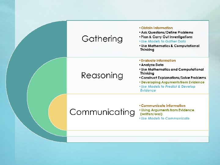 Guppy Debriefing • Brainstorm specific pieces of evidence of student learning in ALL three dimensions • Compare rubric from Biology book with the Success Criteria shared at the beginning • On poster paper, graphically represent how argumentation relates to the 8 SEPs and how it is enhanced by intentional use of the 5 strategies using specific evidence from the guppy experience • Brainstorm topics you teach or data sets to which you could apply the argumentation process