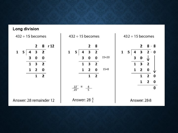 MULTIPLICATION They also need to understand work with certain principles: • Inverse of division • Is commutative i. e. 5 x 4 = 4 x 5 • Is associative i. e. 2 x (3 x 5) = (2 x 3) x 5