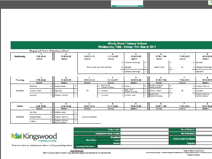 It’s all in a day A typical day at Kingswood runs as follows: • • • Breakfast between 7. 30 am and 9 am First activities kick off around 9. 30 am 15 minute juice break Lunch at 12: 05 A full afternoon of activities 5 minute juice break Evening Meal at 5: 05 pm The Social Sundown evening entertainment at 7: 45 pm Return to dorms at 9: 30 pm Lights out by 10: 15 pm Our activities are: Indoor Laser Orienteering Parachute Games High Equilibrium Aeroball Problem Solving Quad Biking 3 G Swing Bush Craft Nightline High All Aboard Team Challenge Archery Sundown Activities: Mini Olympics Campfire