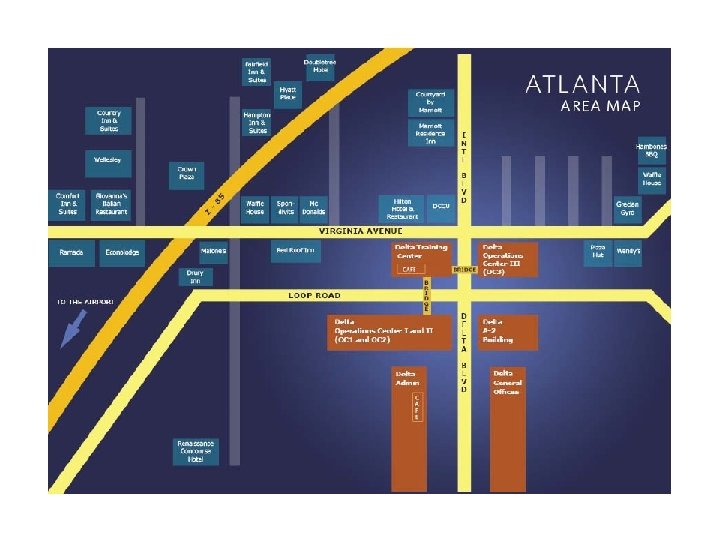Convenient Hotels: Doubletree Hotel Atlanta Airport 3400 Norman Berry Drive, Atlanta, GA 404 -763 -1600 Residence Inn 3401 International Blvd, Hapeville, GA 404 -761 -0511 Holiday Inn & Suites Atlanta Airport North 1380 Virginia Avenue , Atlanta, GA 404 -305 -9990 Courtyard by Marriott 3399 International Blvd, Hapeville, GA 404 -559 -1043 Crowne Plaza Atlanta Airport 1325 Virginia Avenue, Atlanta, GA 404 -768 -6660 Holiday Inn Atlanta Airport South 4669 Airport Blvd, College Park, GA 30337 (404) 763 -8800 Hyatt Place Atlanta Airport South 1899 Sullivan Road, College Park, GA 30337 (770) 994 -2997 Hilton Atlanta Airport 1031 Virginia Ave, Atlanta, GA 404 -767 -9000 Hampton Inn – Atlanta Airport North 3450 Bobby Brown Pkwy, Atlanta GA 404 -767 -9300 Fairfield Inn – Atlanta Airport North 1255 Walker Ave, East Point, GA 404 -767 -5374