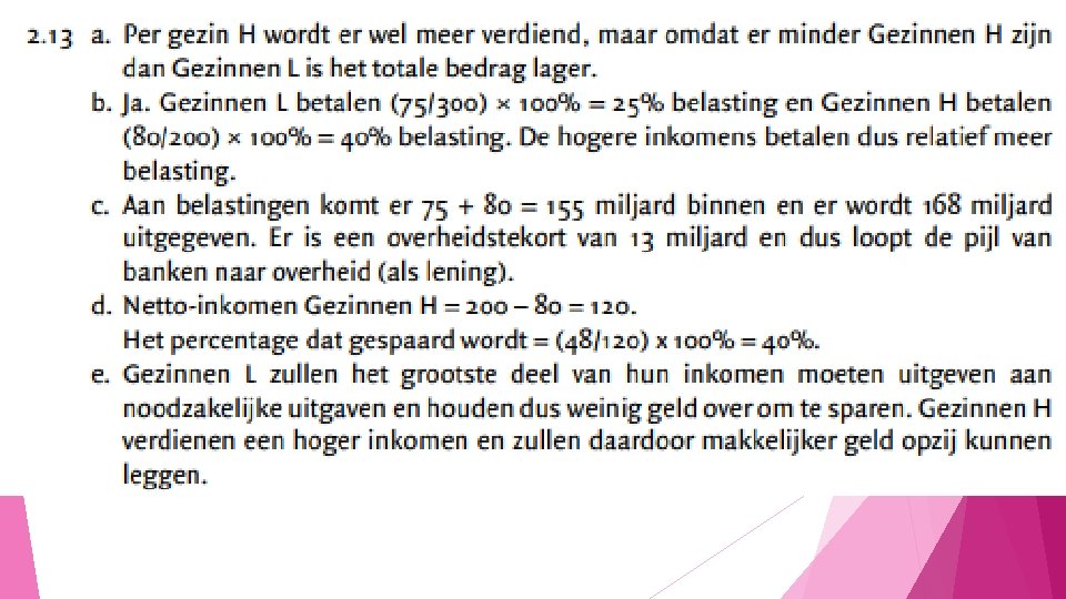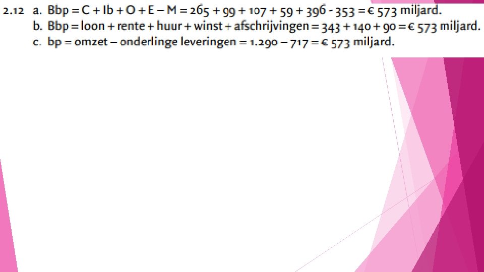 Welke formules moeten we hieruit kennen: Y=C+I+O+E–M 450 = 250 + 80 + 110 + 160 - 150 Y=C+B+S 450 = 250 + 100. S = I + (O – B) + ( E – M) 100 = 80 + (110 -100 = 10) + (160 -150 = 10).