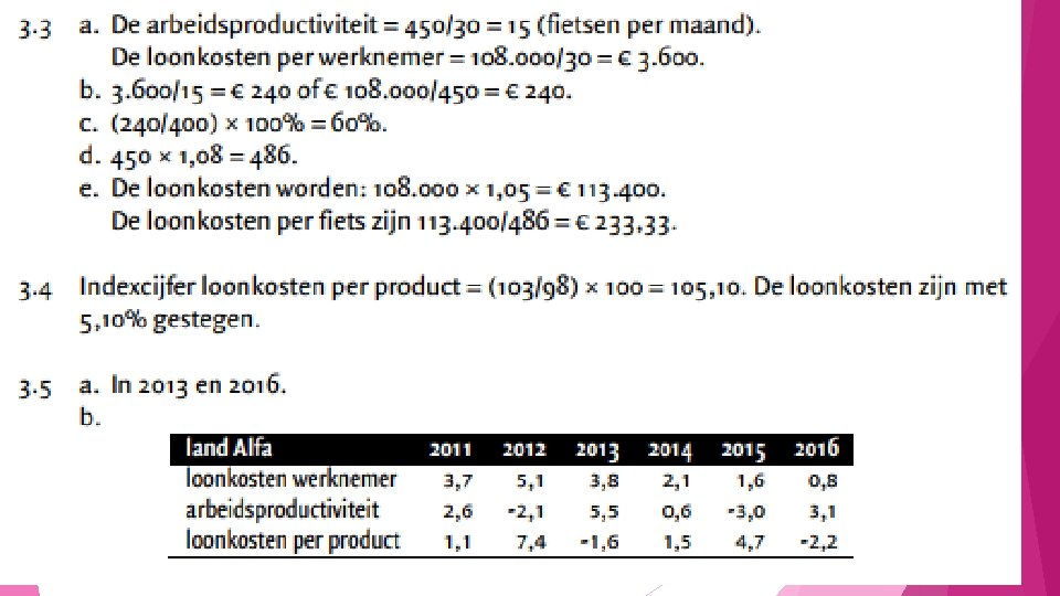 Loonkosten per werknemer Vaak zijn we niet alleen benieuwd naar de loonkosten per werknemer, maar vooral hoe deze loonkosten zich ontwikkelen. Hiervoor gebruiken we: Indexcijfer loonkosten per product = indexcijfer loonkosten per werknemer / indexcijfer arbeidsproductiviteit * 100 (bladzijde 36)
