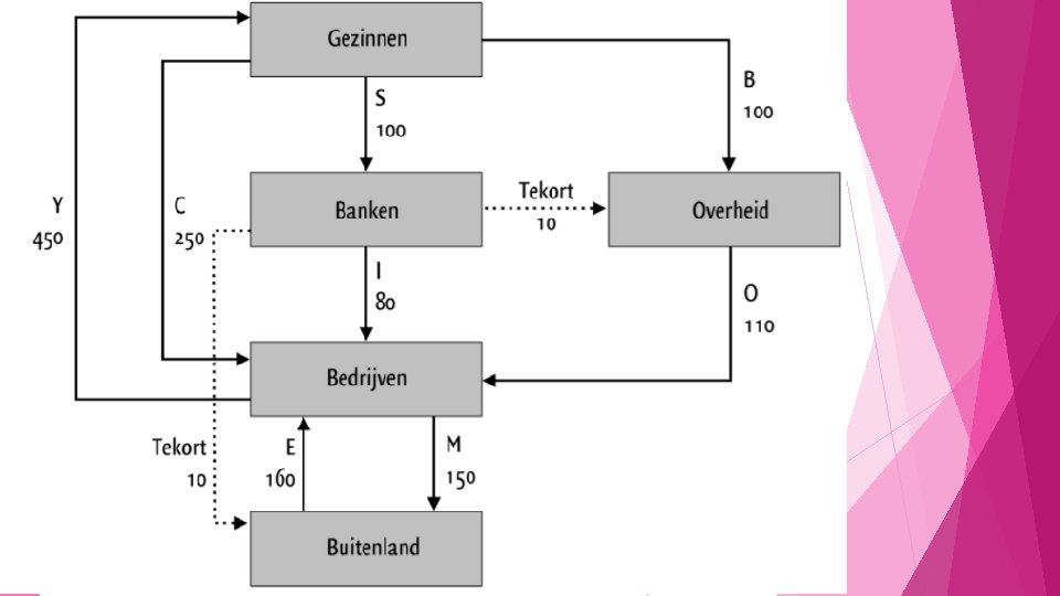 Welke formules moeten we hieruit kennen: Y=C+I+O+E–M 450 = 250 + 80 + 110 + 160 - 150 Y=C+B+S 450 = 250 + 100. S = I + (O – B) + ( E – M) 100 = 80 + (110 -100 = 10) + (160 -150 = 10).