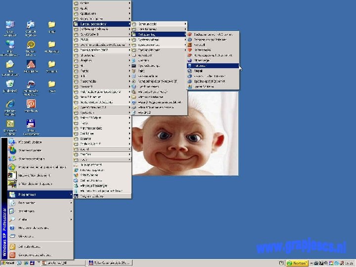 Dit is het bureaublad van Windows, het laat u toe alle nodige acties te ondernemen. Voor een ambtenaar is het uitermate belangrijk de foto van zijn kind op de achtergrond te plaatsen. Alzo zal hij zich herinneren dat hij nog naar de moeder (zijn minnares) moet bellen en vernemen of de kleine naar zijn papa heeft gevraagd en zijn flesje goed heeft leeggedronken.