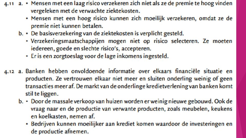 Marktfalen door asymmetrische informatie en averechtse selectie. Asymmetrische informatie : 1 partij weet meer dan de andere partij. Bijvoorbeeld op de 2 de hands automarkt. Asymmetrische informatie kan leiden tot averechtse selectie Averechtse selectie: alleen slechte risico's verzekeren zich waardoor de premies stijgen en alleen nog meer slechte risico’s zich verzekeren ect.