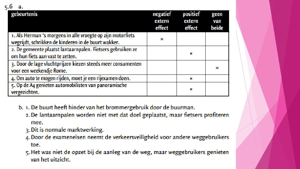 Belangrijk! Het is alleen extern effect als het niet in de prijs verwerkt zit. Vliegtuigmaatschappijen betalen milieubelasting omdat de brandstof van vliegtuigen het milieu aantast. Deze belasting berekenen de vliegtuigmaatschappijen door in de prijs. Dus in de prijs zit een gedeelte wat naar de overheid gaat die het geld gebruikt om het milieuprobleem aan te pakken. Milieuvervuiling is hier dus geen extern effect, het zit in de prijs opgenomen.