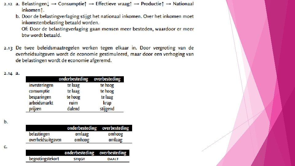 Wat hebben we gezien: Klassieke zeiden: loon = kosten, marktmechanisme lost dit op, zo min mogelijk overheidsbemoeienis. Keynes zei: loon = koopkracht, marktmechanisme lost dit niet op, de overheid moet ingrijpen. Hoe kan de overheid dit doet? Zelf meer of minder gaan besteden. Of ervoor zorgen dat gezinnen meer of minder gaan besteden door aanpassing belastingen/premies/uitkeringen.