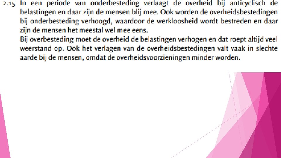 conjunctuurbeleid We hadden hoogconjunctuur (hoge economische groei, mogelijke bestedingsinflatie) We hadden laagconjunctuur (lage economische groei of zelfs daling, mogelijk werkloosheid) Als we proberen de conjunctuur af te remmen (dus in hoogconjunctuur de economische groei laten afnemen, in laag conjunctuur de economische groei stimuleren) Spreken we van een anti cyclische conjunctuurbeleid. Tegen de cycli in.