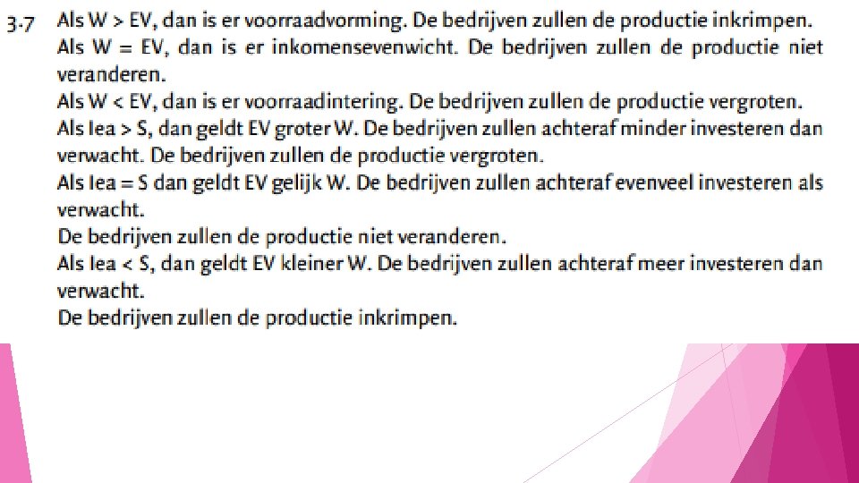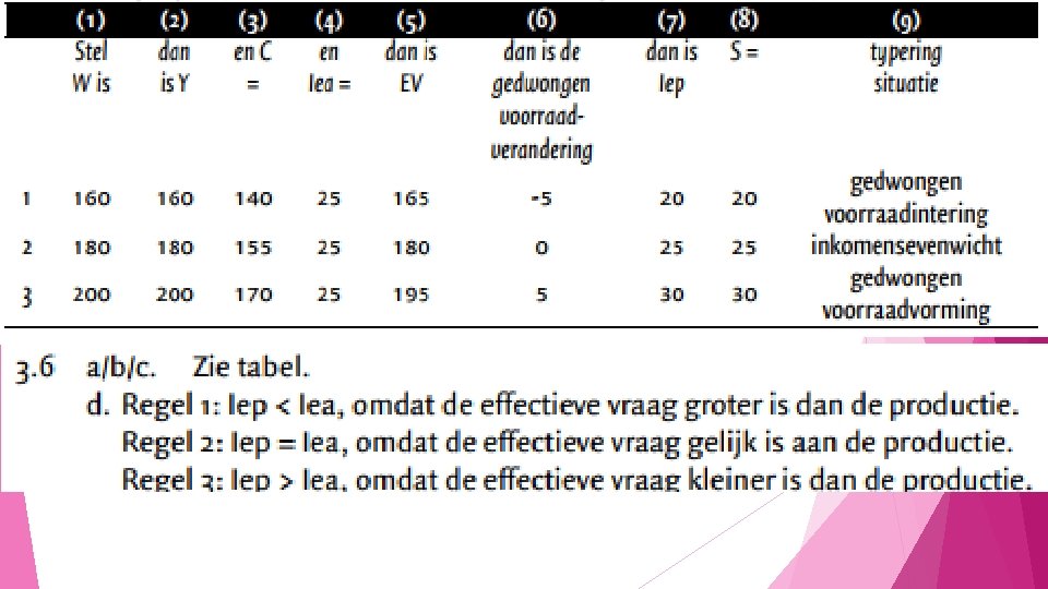 Y (nationaal inkomen) = Consumptie + Sparen Voordat ondernemers gaan produceren bepalen ze eerst een aantal verwachte investeren (Lea). W (productie groter is dan EV (effectieve vraag) investeren bedrijven in voorraad, dan zijn de investeringen achteraf (Iep) groter dan de investering die vooraf verwacht werden (Lea). Deze extra investeringen zijn mogelijk, omdat de gezinnen blijkbaar meer hebben gespaard dan van te voren gedacht. (tenslotte de consumptie viel tegen, dan vallen de besparingen mee). De besparingen = gerealiseerde investeren (Lep).