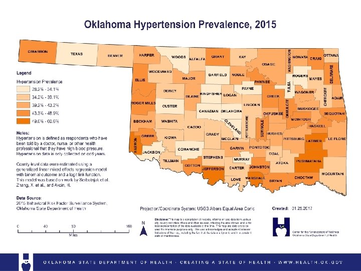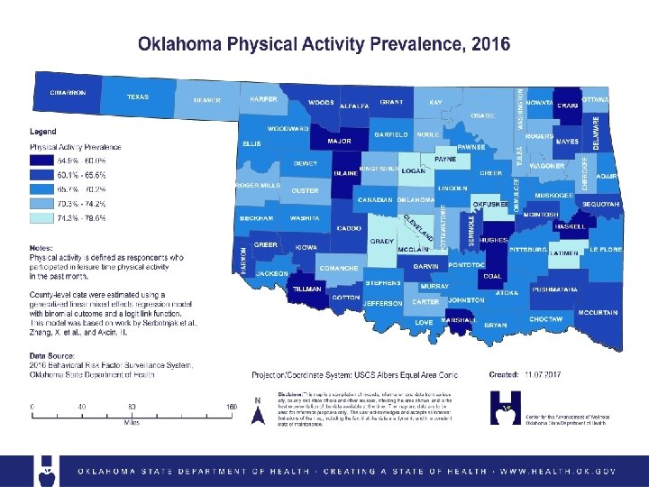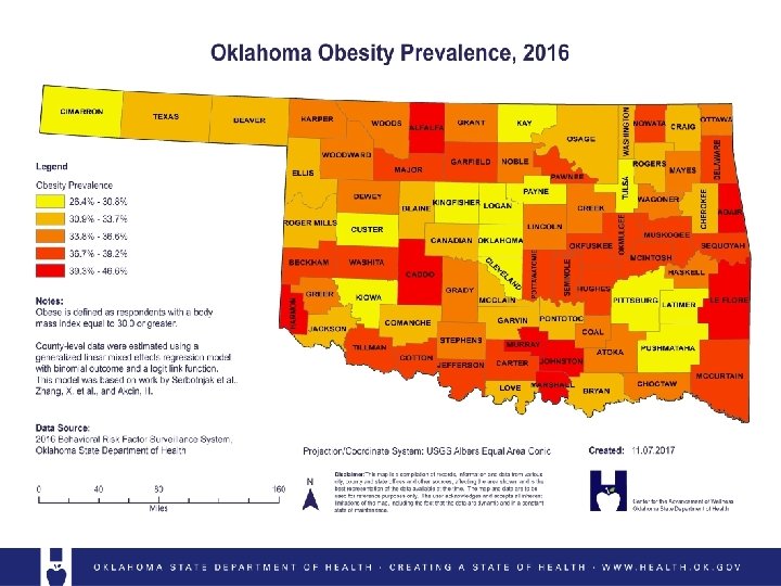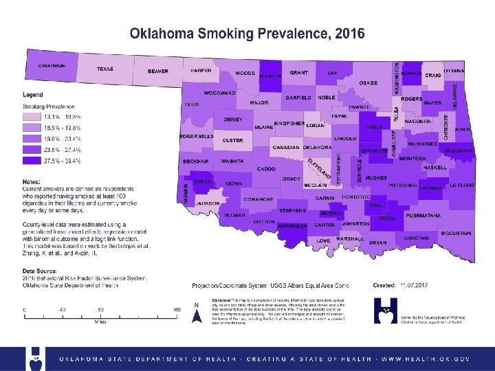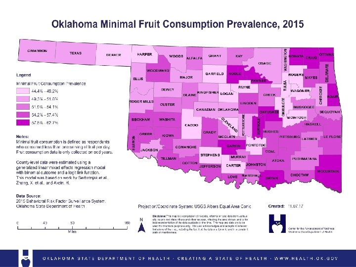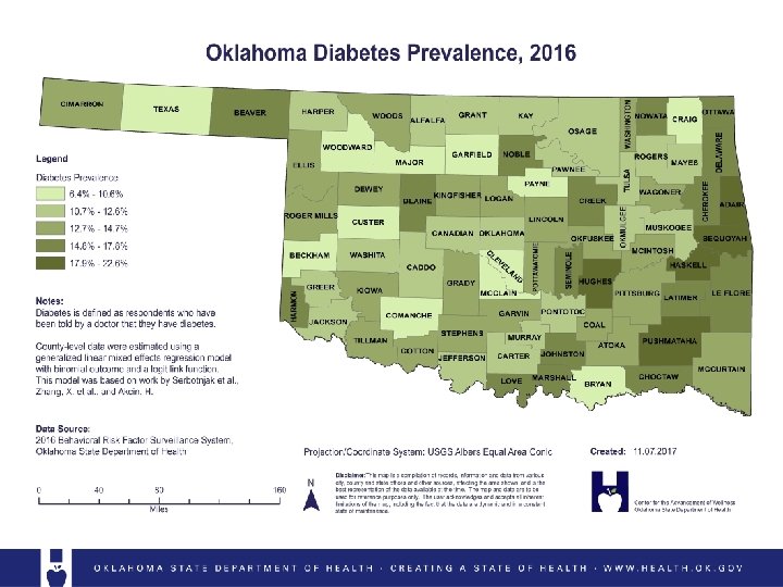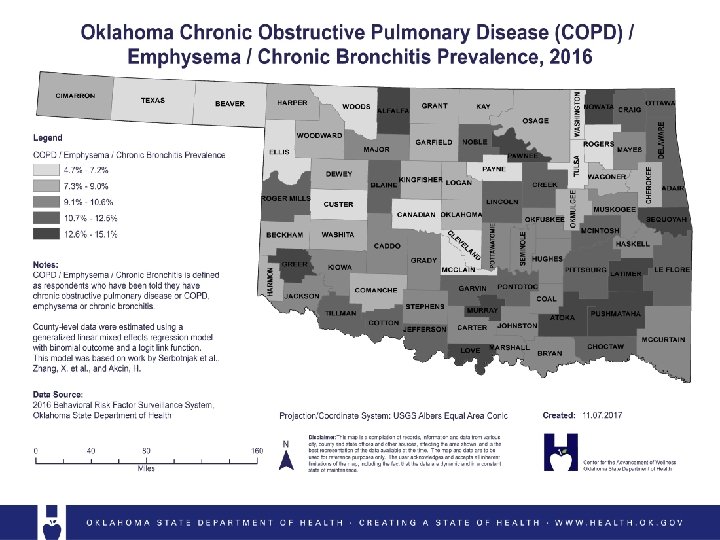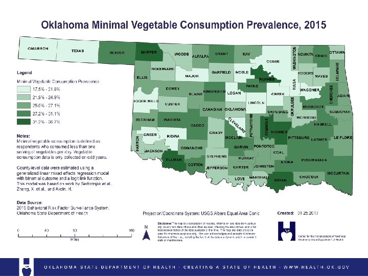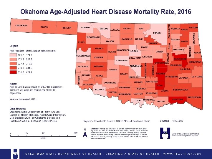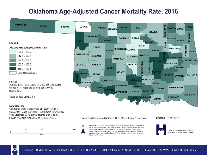 Legend Notes *Chronic Obstructive Pulmonary Disease ^Consumed < 1 serving of vegetable/fruit per day ¶Age-adjusted rates based on 2000 US population standard. All rates are deaths per 100, 000 population. §Status compares county’s 2015 -16 to Oklahoma 2015 -16. Vegetable, Fruit and Hypertension data are only available for odd years; data is carried to even years as placeholders. Sources 1. Oklahoma State Department of Health, Center for Health Statistics, Health Care Information, Behavioral Risk Factor Surveillance System, 2012 -2016. 2. Oklahoma State Department of Health (OSDH), Center for Health Statistics, Health Care Information, Vital Statistics (OK 2 SHARE), 2012 -2016. Better than state outcome ± 0. 5 from state outcome Worse than state outcome