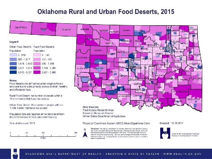 Modified Retail Food Environmental Index (percent of population) High Healthy Food Access (High Access) 31. 9% Moderate Healthy Food Access (Moderate Access) 49. 6% Low Healthy Food Access (Low Access) 0. 0% No Healthy Food Outlet (Poor Access) 18. 5% No Food Outlet (No Access) 0. 0% Sources 1. Community Commons (2012). Retrieved November, 2017, from www. communitycommons. org a. US Census Bureau, County Business Patterns. Additional data analysis by CARES. 2015. Source geography: County b. US Department of Agriculture, Food and Nutrition Service, USDA - SNAP Retailer Locator. Additional data analysis by CARES. 2016. Source geography: Tract c. US Department of Agriculture, Economic Research Service, USDA - Food Access Research Atlas. 2015. Source geography: County d. US Department of Agriculture, Economic Research Service, USDA - Food Access Research Atlas. 2015. Source geography: Tract e. Centers for Disease Control and Prevention, Division of Nutrition, Physical Activity, and Obesity. 2011. Source geography: Tract Notes *Rate per 100, 000 population ^Rate per 10, 000 population §Status compares county to Oklahoma data