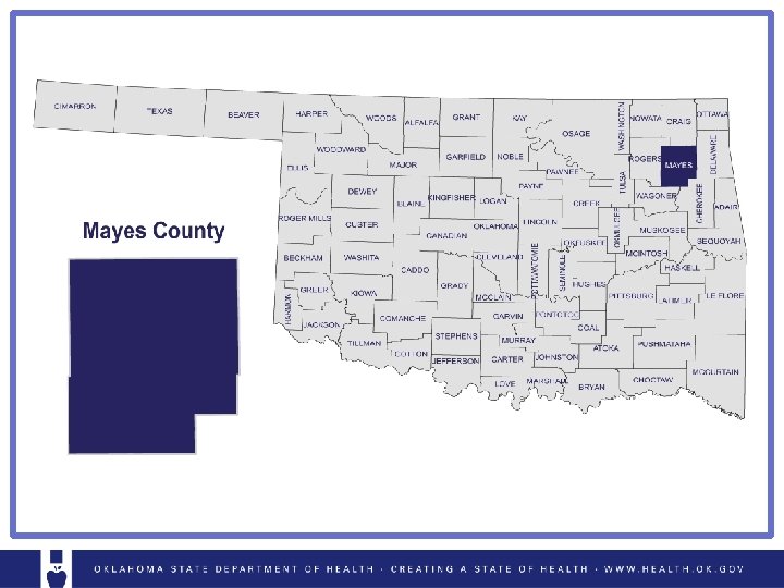 MAYES Population – 40, 920 Insurance Coverage Uninsured High School Dropouts: Class of ‘ 16 Unemployment Rate (2013 -2015) Insured Mayes 5, 0 Mayes 9, 9% 17, 7% 82, 3% Oklahoma 4, 7 Oklahoma 7, 2% Oklahoma Uninsured – 16. 1% Below Poverty Age Groups Race Poverty Above Poverty White (NH) 65, 2% 65 Years & Over 18, 5% African American (NH) American Indian & Alaska Native (NH) Asian (NH) 17, 7% 0, 7% 22, 0% Under 18 Years 24, 0% 0, 4% 81, 5% Two or more Races 9, 4% Under 5 Years Oklahoma Poverty – 16. 3% Hispanic or Latino 6, 1% 3, 4% Sources 1. United States Census Bureau, State and County Quick Facts, 2016. 2. Unemployment rate data based on U, S, Bureau of Labor Statistics, 2013 -2015. 3. High School Dropouts data provided by the Office of Accountability using data from the Oklahoma State Department of Education.