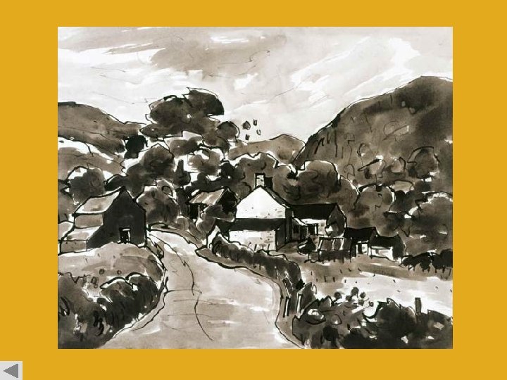 1. Discussion Landscape is one of the main images found in art over the centuries and we are going to look at examples of landscapes by some of Wales’ most famous artists. Here we see a landscape by Sir Kyffin Williams. By placing a road in the forefront to draw us in to the image, he has created a perspective effect. His subtle use of ink and wash has produced density of tone and texture, which creates effective shadowing and distance. Sir Kyffin Williams Rhwng Dwy Afon Cyffylliog / Hendre