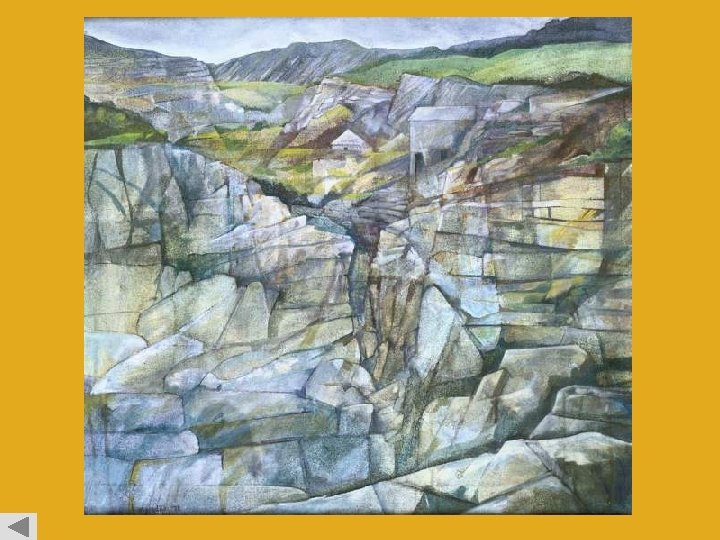 Here we see another image of a quarryscape, this time by Graham Meredith, which shows a completely different style. The composition of both paintings is quite similar, but Graham Meredith is much more subtle with his paint, which created a lightness and beauty, words not usually associated with quarries. Graham Meredith Quarryscape, Minera, 1978