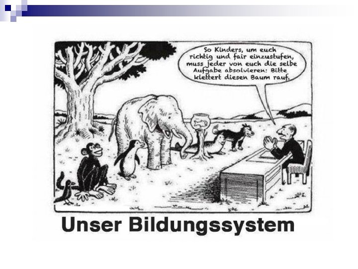 Wir bieten (weitest gehend) eine Schule die… n n n n defizitorientiert ist leistungs- und wettbewerbsorientiert ist selektierend wirkt mit Noten die Schulkarrieren von Kindern bestimmt Schüler nur durch Noten beurteilt den schriftlichen Leistungen den größten Stellenwert gibt sich im Wesentlichen auf die kognitiven Fähigkeiten beschränkt