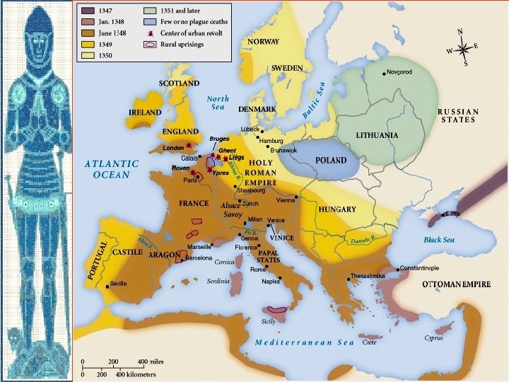 Consequences of the Black Death: v Killed 1/3 of European population (19 -38 million) v Trade declined; prices rose (inflation); rise in real wages v Guilds opened up to new members v Serfdom ends in Western Europe v Nobles resist demands for higher wages (English Statute of Laborers (1351) v Peasant Revolts (English Peasants’ Revolt of 1381) v. Standard of living in towns & per capita income rose