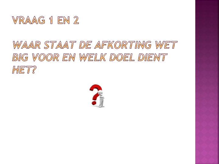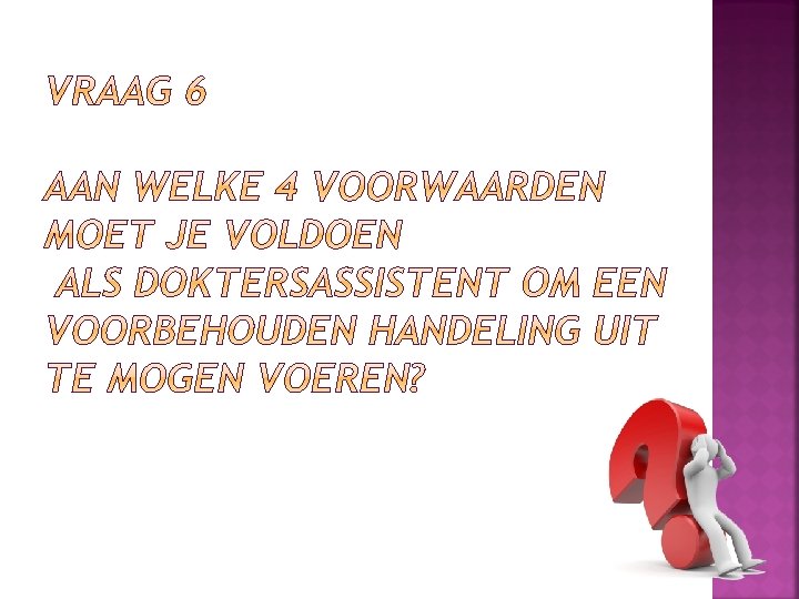 Werk de volgende vragen uit: 1. Waar staat de afkorting wet BIG voor? 2. Welk doel dient de wet BIG? 3. Wat houdt een voorbehouden en niet voorbehouden handeling in? 4. Valt injecteren onder een voorbehouden handeling? 5. Beschrijf 2 niet voorbehouden handelingen, die je als doktersassistent uit mag voeren. 6. Aan welke 4 voorwaarden moet je voldoen als doktersassistent om een voorbehouden handeling uit te mogen voeren?