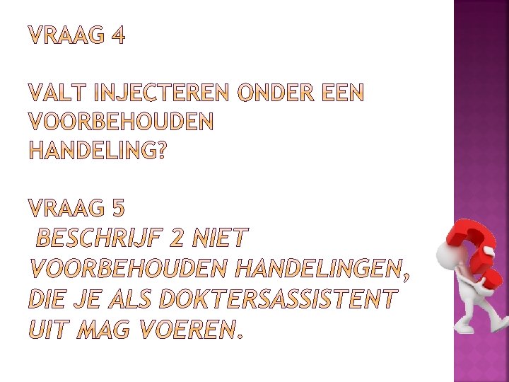 13 voorbehouden handelingen: ü ü ü ü Heelkundige handelingen Verloskundige handelingen Endoscopieën Katheteriseren Injecteren Puncties Narcose ü ü ü Kunstmatige fertilisatie Stenenvergruizing Gebruik van radioactieve stoffen en ioniserende straling Cardioversie Defibrilleren Electroconvulsie