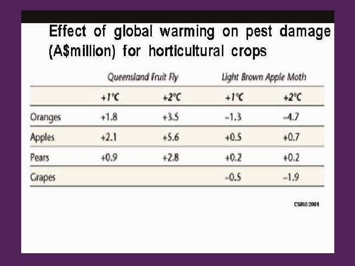 Some Specific Impacts Wheat : • • • faster growth less grain filling high yield lower grain protein not bread making or pasta grain Fruit : • • • esp apples stone fruits southern Aus less frost damage less chilling less bud burst lower fruit set lower yield reduced quality