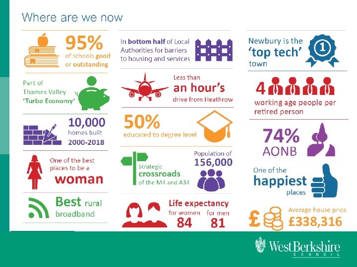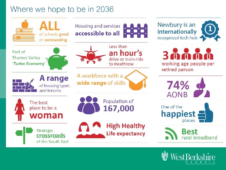 Five key areas A West Berkshire: • where everybody has what they need to fulfil their potential • with a housing mix with something for everyone • that welcomes business, enterprise and industry into a productive, growing and dynamic local economy • where the health and wellbeing of residents of all ages is prioritised • with both beautiful, natural landscape and a strong cultural offering